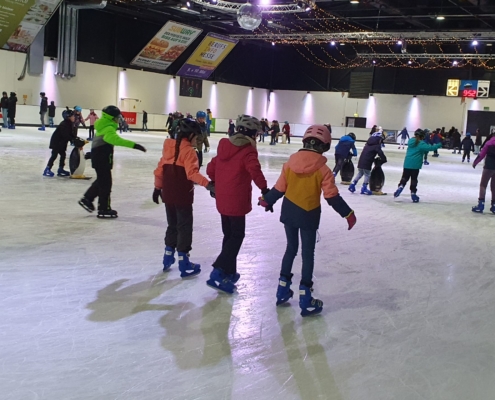 Hier gab es eine kleine Einweisung vom hiesigen Personal, damit es auch mit dem Ausleihen der Schlittschuhe, Anziehen und der Rückgabe schnell gehen konnte. Viele Kinder waren schon etwas aufgeregt, zumal einige davon noch nie auf dem Eis gestanden hatten. Doch die geliehenen „Eispinguine“ gaben ihnen die nötige Sicherheit und die Lehrkräfte gaben ihr Bestes, dass sich alle auf dem ungewohnten Terrain wohlfühlten.
