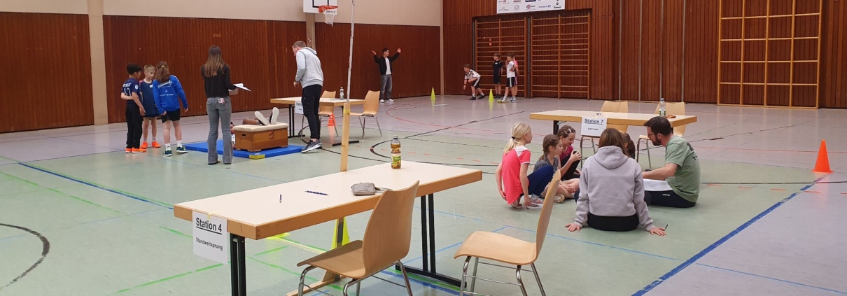 Danach wurden die Kinder in mehrere Gruppen eingeteilt und durchliefen – begleitet und unterstützt von engagierten Zehntklässlern (R10a) der Realschule – insgesamt sechs sportliche Stationen sowie eine Interview-Station. An den verschiedenen Stationen wurden durch die Sportlehrkräfte zentrale motorische Fähigkeiten überprüft: Koordination beim Balancieren, Beweglichkeit, Schnelligkeit im Sprint, Kraft und Schnellkraft sowie Kraftausdauer.